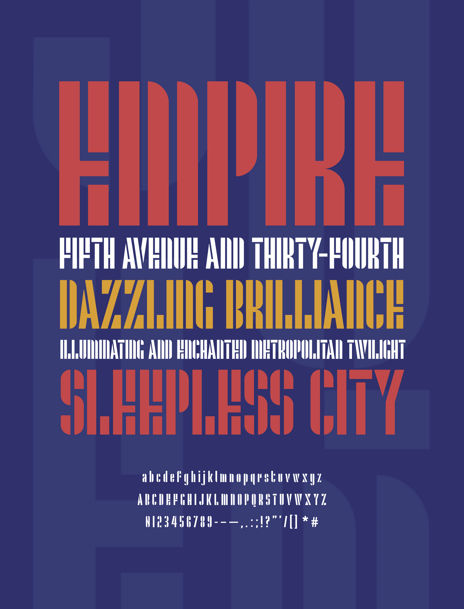 EMPIRE is a bold stencil typeface inspired by this specimen found in Doug Thomas’s grandfather’s storage. EMPIRE draws further influence from Art Deco and jazz.